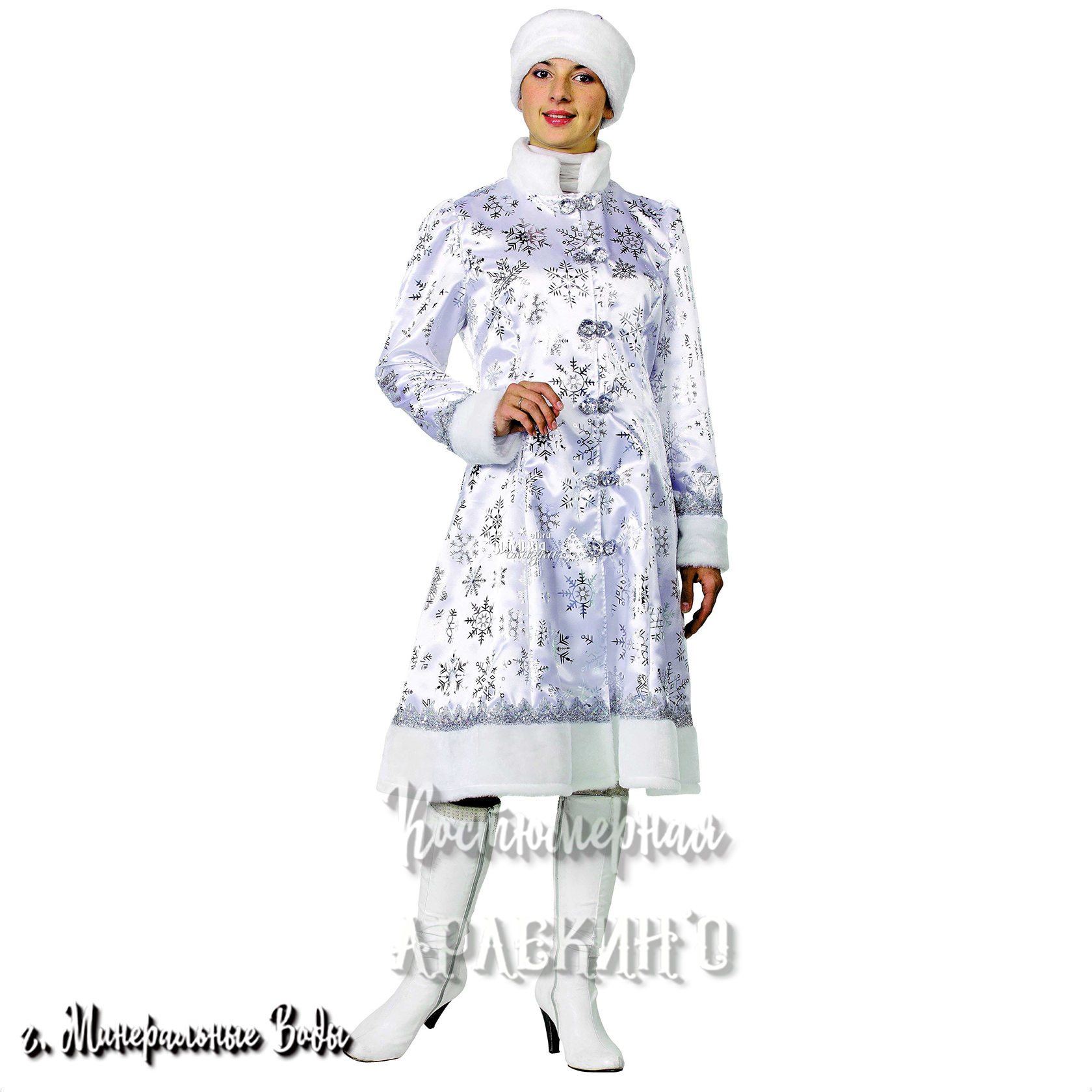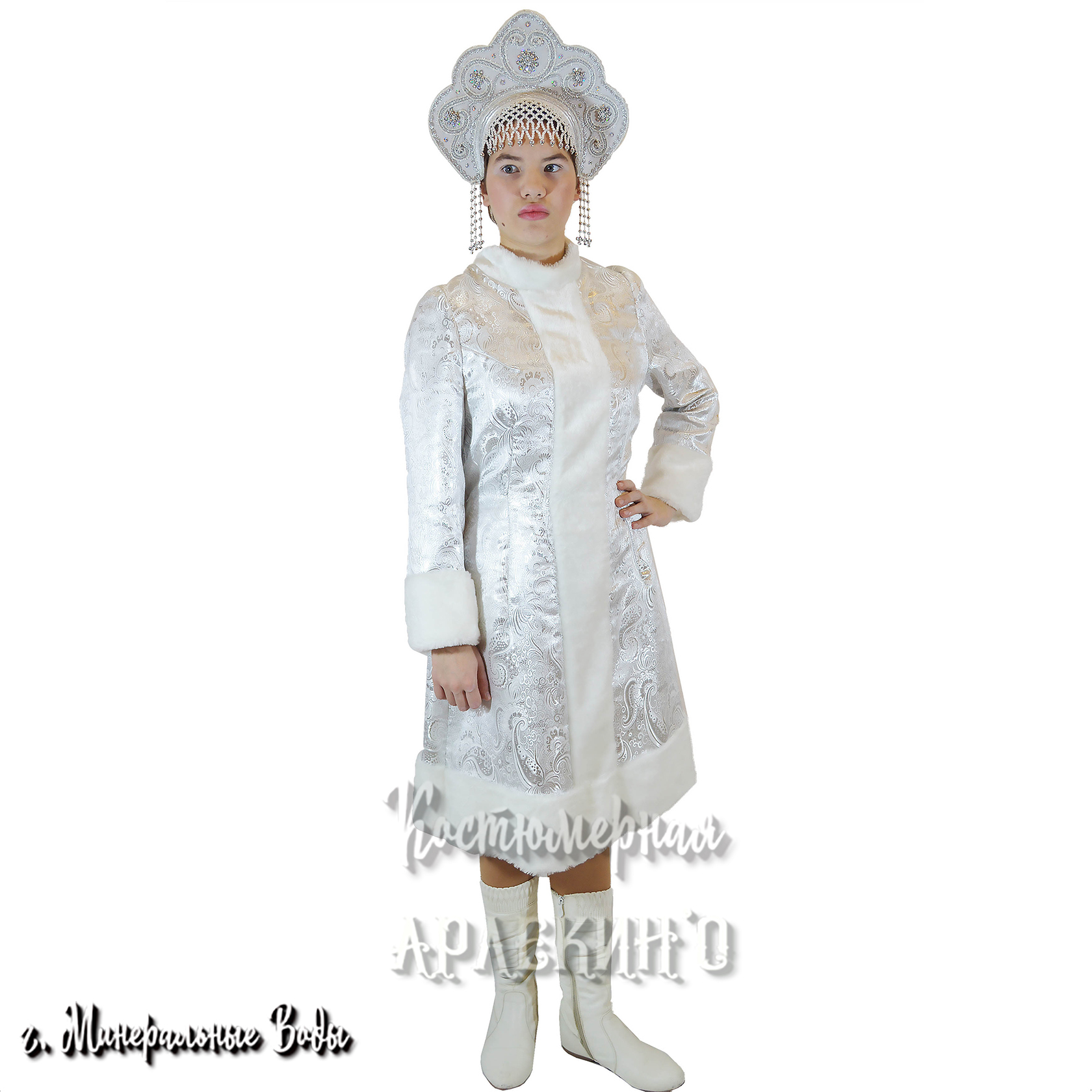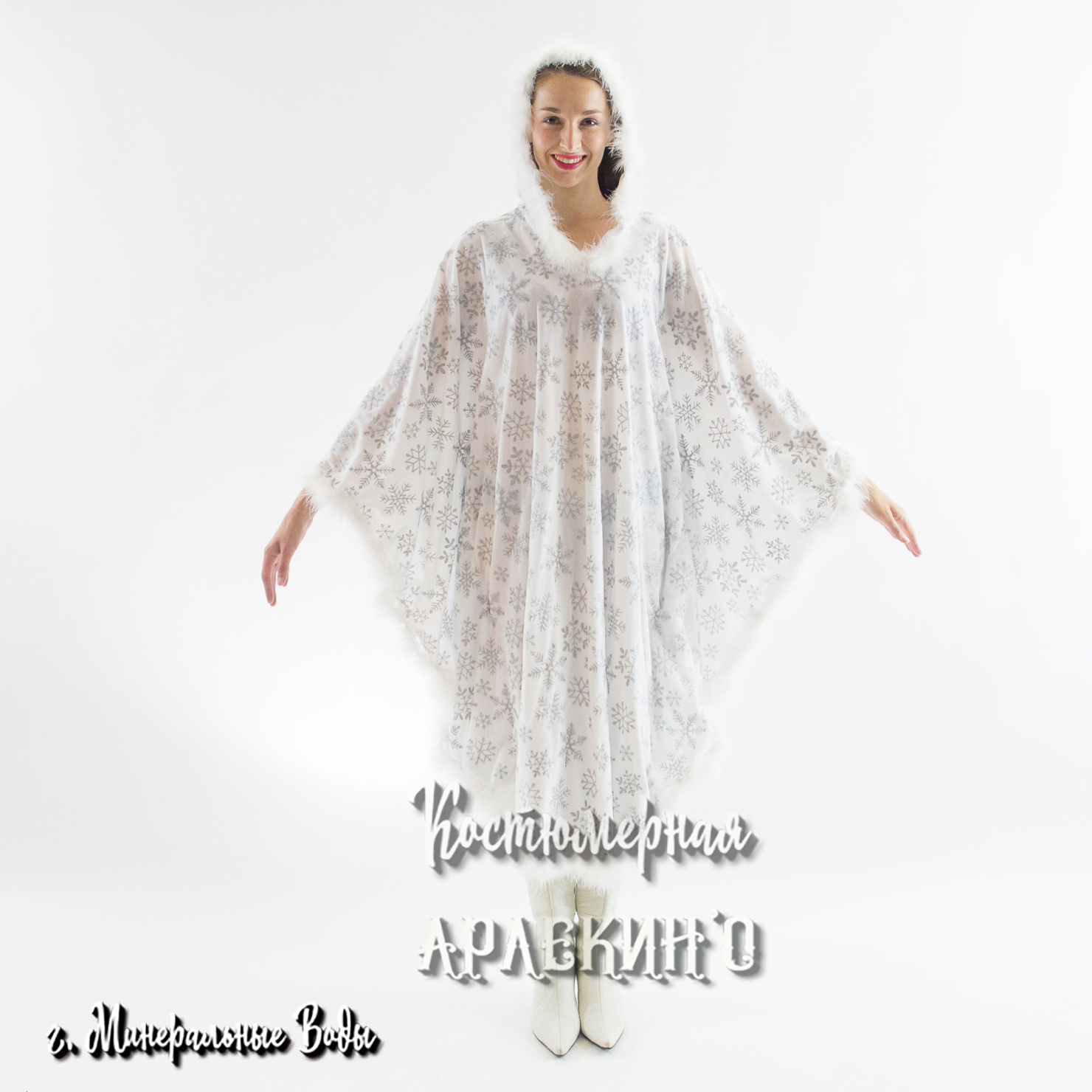 Красивый и удобный костюм для новогоднего утренника, проводов зимы или сказочного представления. Белоснежная плюшевая накидка с капюшоном украшена невероятно яркими снежинками из серебристых блёсток. Нижний край шубки и капюшона декорированы лёгким белым пухом. Свободный крой не сковывает движения и позволит вашему ребёнку активно петь, танцевать и участвовать в весёлых конкурсах.